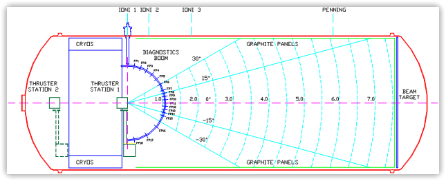 The LVTF-1 is equipped with a water cooled beam target is mounted at the chamber end opposite w.r.t. the cryogenic system. The target is covered with pure graphite plates to minimise sputtering toward the thruster. The interior of the test facility is also fully lined with pure graphite panels. To date, two thruster position along the chamber axis can be chosen: